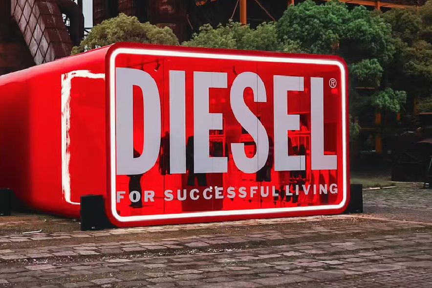 The store has set up an immersive display area, featuring the iconic Diesel red color, colliding with the metallic texture, Passionate, bold, and unrestrained.